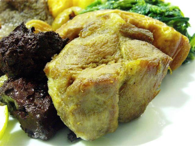 Cozer a carne de vaca, galinha velha, osso da suã, presunto e cravinhos, uma cenoura pequena, cebola (pequena), louro, salsa e sal. Depois, retirar as carnes e desfiá-las. Logo que possa, coar o caldo e juntar pão de trigo cortado à mão, em pedacinhos. Mexer bem até ficar com a consistência de sopa forte. Juntar sangue de porco cozido, esfarelado previamente num “passe-vite” e temperar com cominhos, sumo de limão e pimenta. As quantidades ficam ao critério de cada um, uma vez que nem todo o pão é igual. Deve ficar um caldo consistente e saboroso.